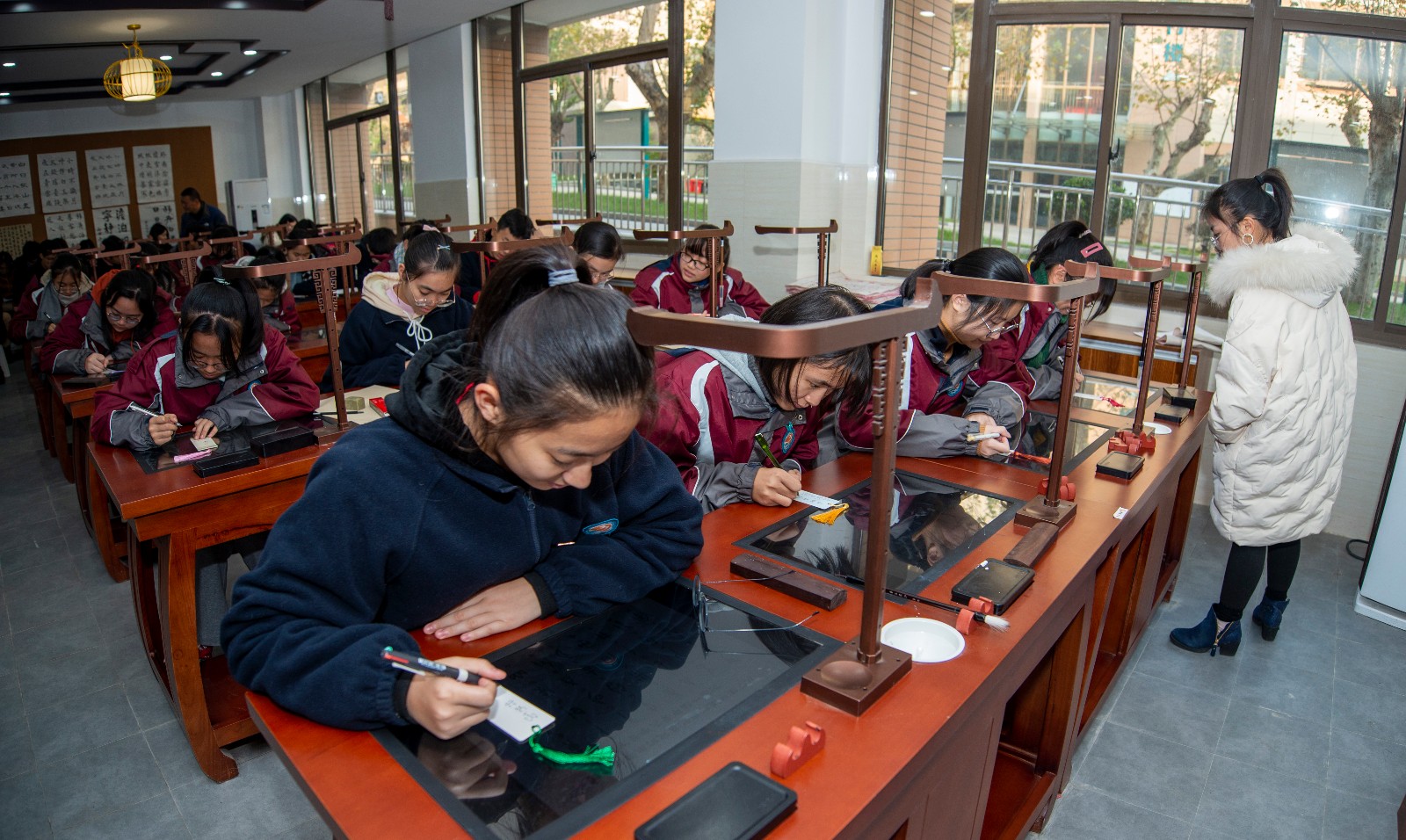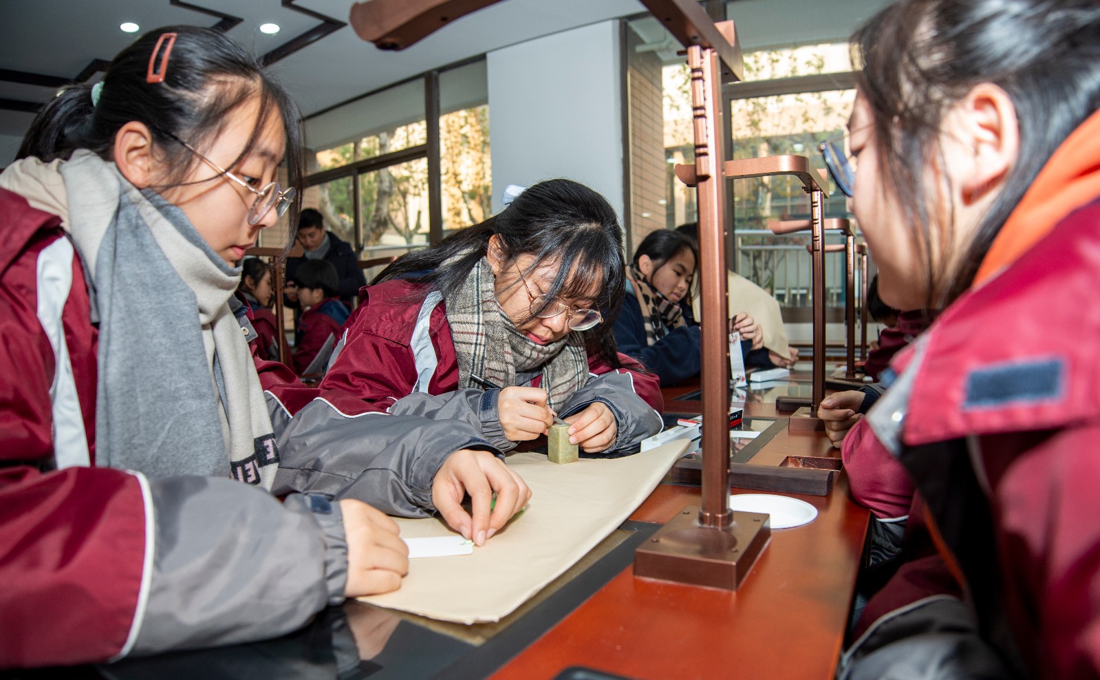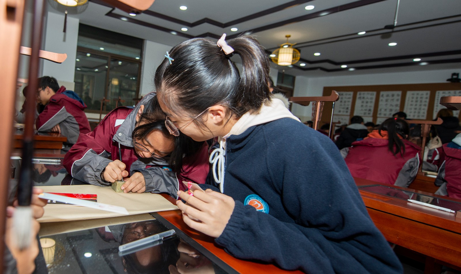 王明茗老师的课题是《天真烂漫文字情——大篆赏析》。课堂伊始,王老师用学生熟知的《琅琊榜》电视剧中有关书法的场景作为导入,激发学生的学习热情。然后,分别从大篆的两种文字形态——甲骨文与金文展开教学,把理论知识融合在情境教学中。例如,在总结甲骨文文字特点时,请同学们自己体会操刀刻石的感觉,从而得出甲骨文的用笔特点及结字规律;在说到青铜器的铸造时,用实物投影的方式将事先准备好的文字模具压制在超轻黏土上,现场模拟呈现出金文的压制过程,从而更加直观的说明问题。最后,王老师请同学们自己创作一副甲骨文作品,制作出精美的甲骨文书签。王老师运用丰富的教学方法,将原本晦涩难懂的理论知识转化为一堂生动有趣的书法课。