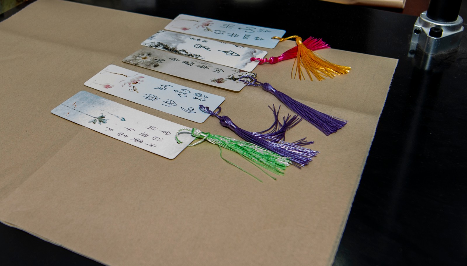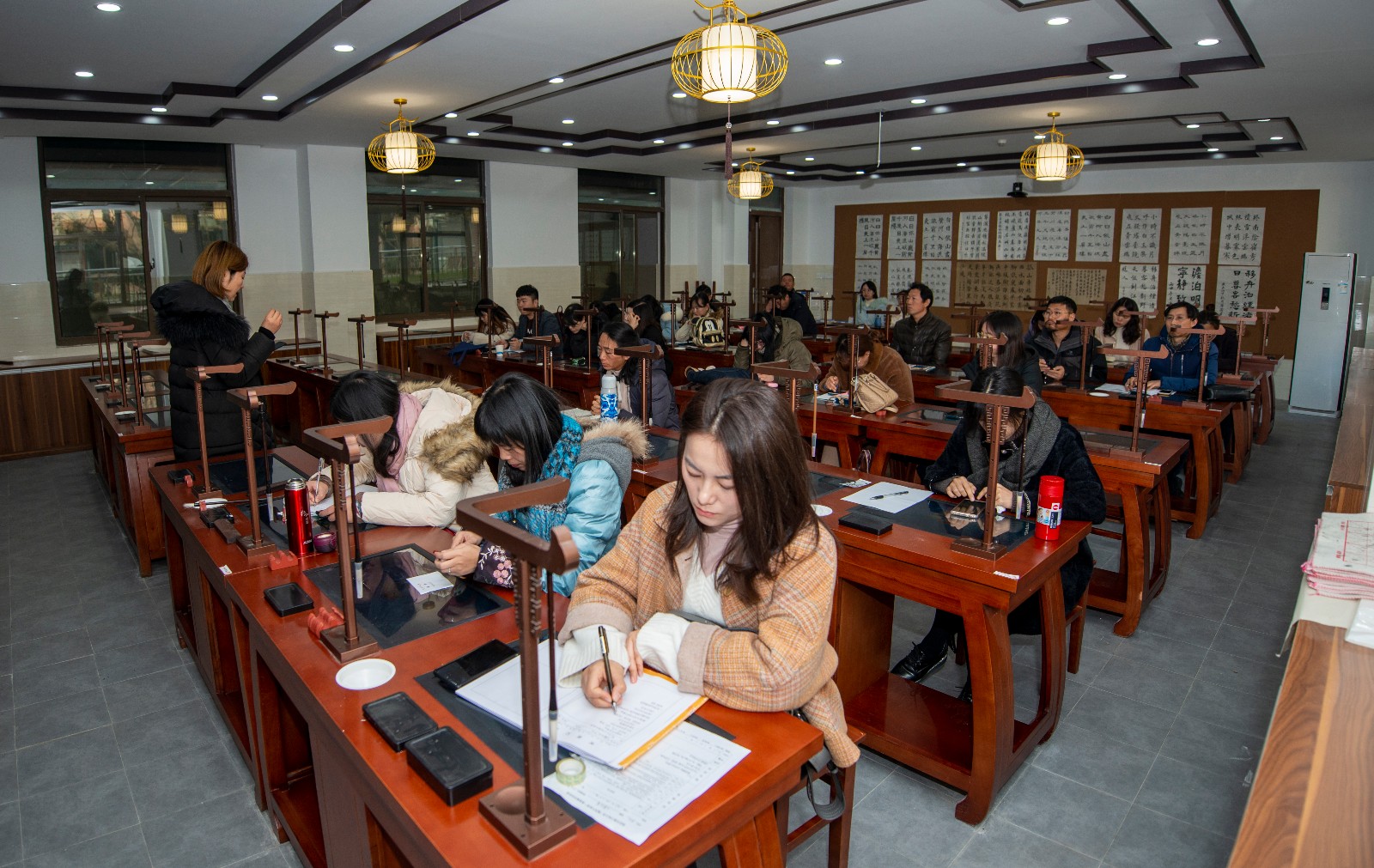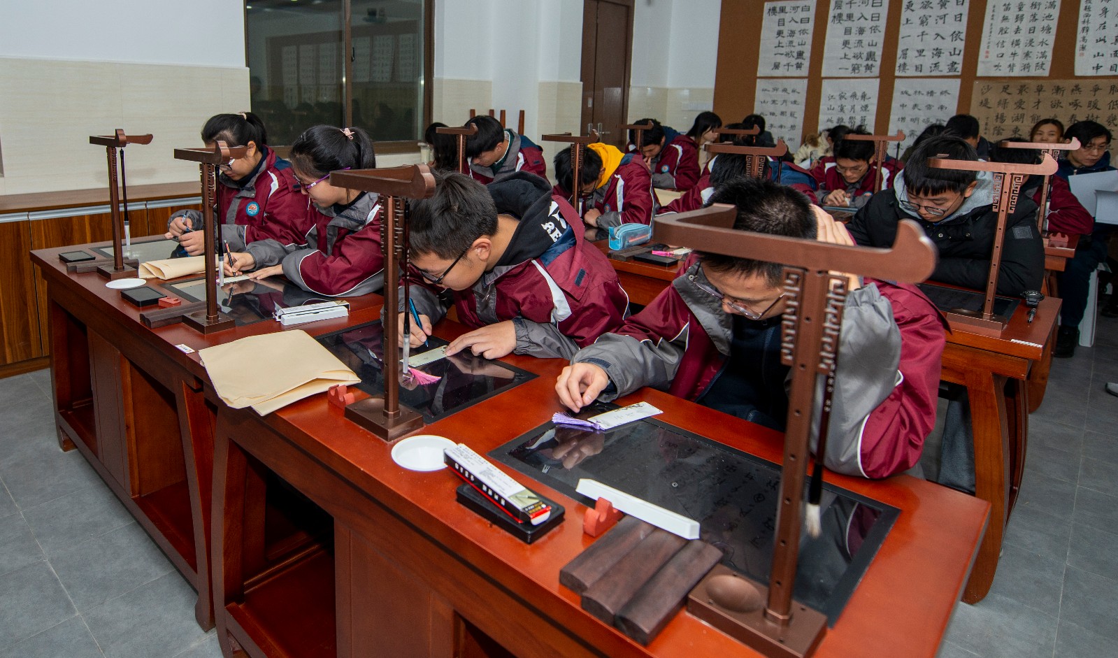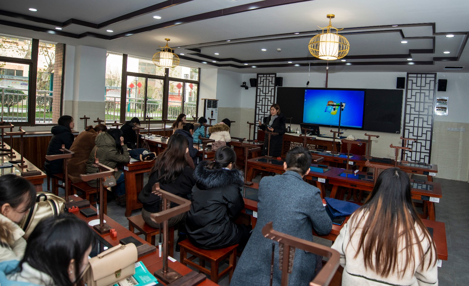 王明茗老师的课题是《天真烂漫文字情——大篆赏析》。课堂伊始,王老师用学生熟知的《琅琊榜》电视剧中有关书法的场景作为导入,激发学生的学习热情。然后,分别从大篆的两种文字形态——甲骨文与金文展开教学,把理论知识融合在情境教学中。例如,在总结甲骨文文字特点时,请同学们自己体会操刀刻石的感觉,从而得出甲骨文的用笔特点及结字规律;在说到青铜器的铸造时,用实物投影的方式将事先准备好的文字模具压制在超轻黏土上,现场模拟呈现出金文的压制过程,从而更加直观的说明问题。最后,王老师请同学们自己创作一副甲骨文作品,制作出精美的甲骨文书签。王老师运用丰富的教学方法,将原本晦涩难懂的理论知识转化为一堂生动有趣的书法课。